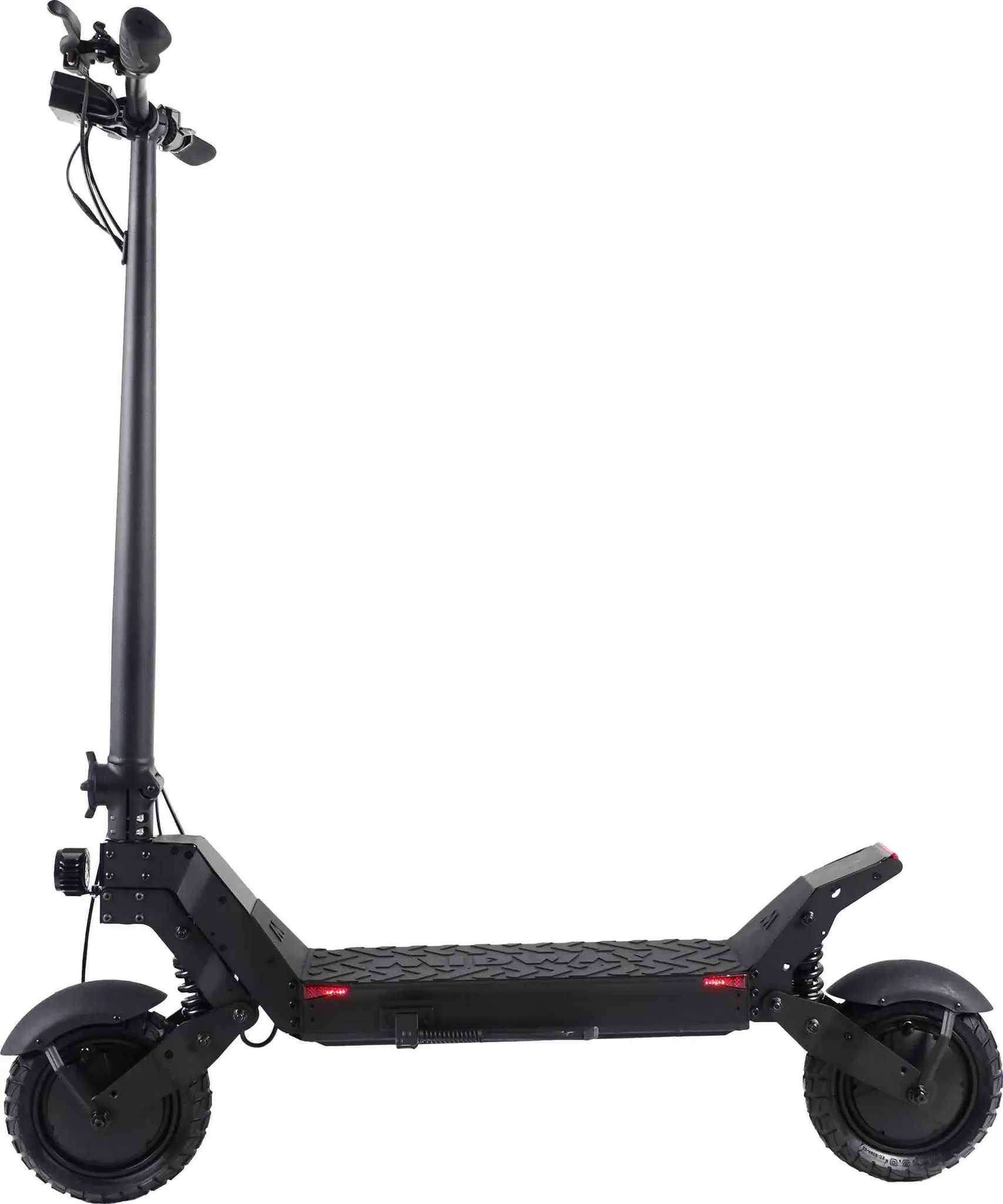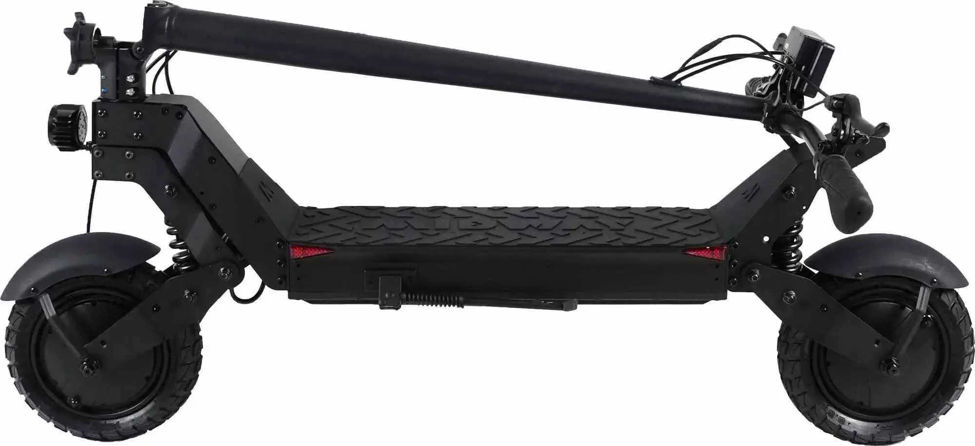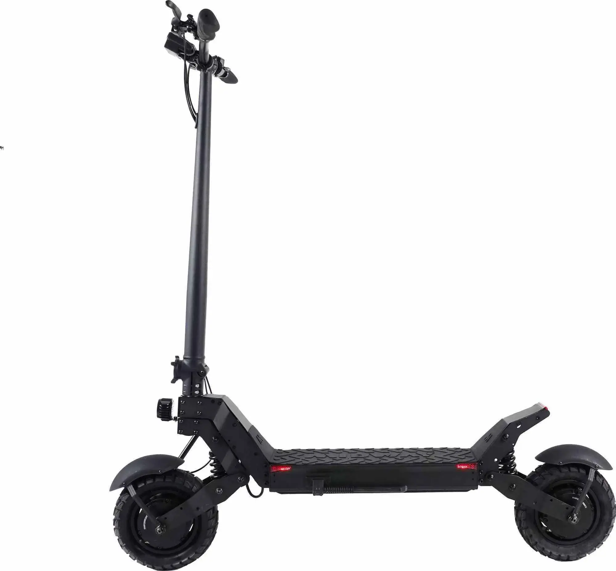 Электрический самокат полноприводный. Оборудован двумя мотор-колёсами номинальной мощностью 2000W, благодаря чему транспорт разгоняется за считанные секунды до 50 км/ч. Такого двигателя хватит, чтобы забираться в горки под углом 20 градусов. Аккумуляторная батарея встроена в деку и имеет стандарт защиты от пыли и влаги IP54. Ёмкость АКБ 48V 18Ah позволит проехать расстояние до 45 км на одном заряде. Время полного заряда батареи 4-6 часов.