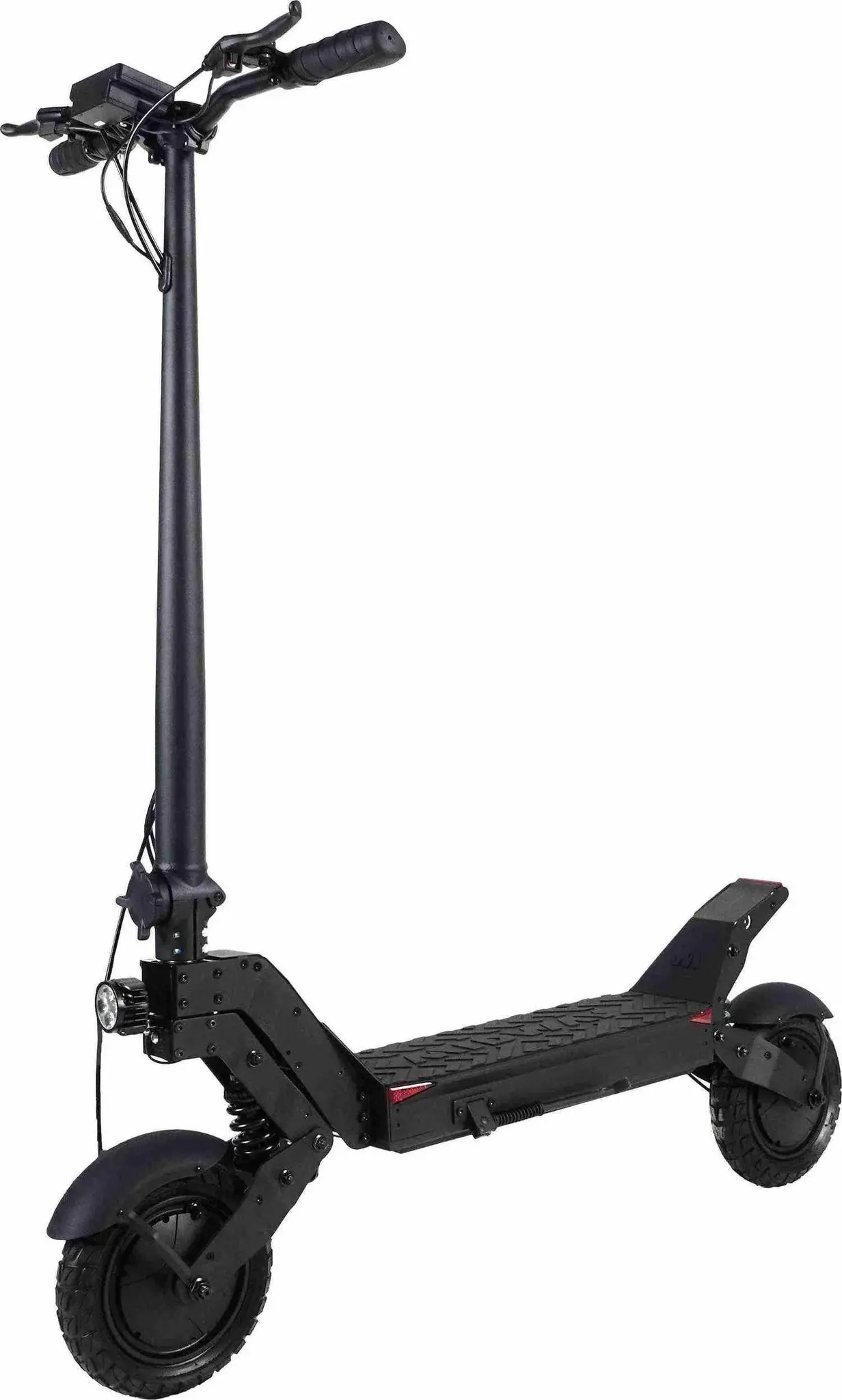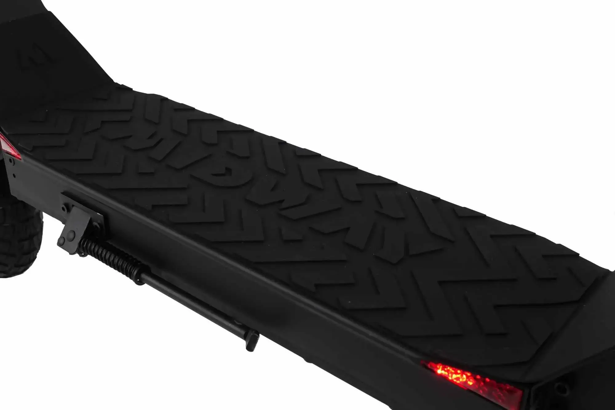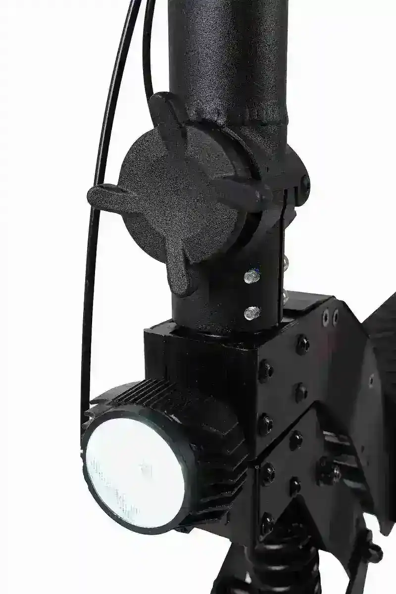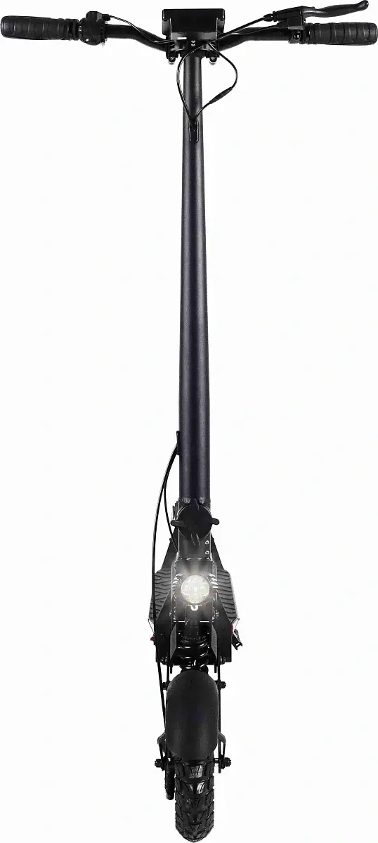 Так же он оснащён яркой передней фарой 10 WLED, которая освещает путь на несколько метров вперед в тёмное время суток. Тормозная система выполнена в виде дискового тормоза. Клиренс в 21 см позволит преодолевать небольшие бордюры. Самокат имеет лёгкую в освоении складную систему. В сложенном виде габариты данной модели 122*18*57см, а в разложенном 122*60*132см.