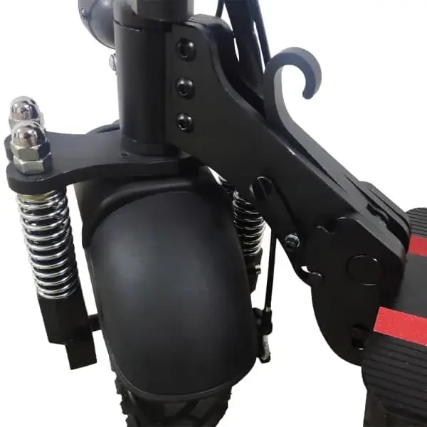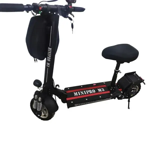 Рама электросамоката сделана из алюминия. Все крепления прочные — в зоне складного механизма руля и ручек нет никакого люфта. Весит M3 27 килограммов. Такой вес помогает MiniPro быть устойчивым на неровных дорогах. Сиденье идет в комплекте. Оно сделано из экокожи, очень большое и мягкое. Если вы захотите поездить стоя, его можно полностью убрать. Колеса M3 — накачиваемые, 10.5-дюймовые. Дополняют их двойные пружинные амортизаторы. К тому же, их можно настроить под свой вес. Так электросамокат MiniPro будет хорошо сглаживать неровности и не будет “проседать”.