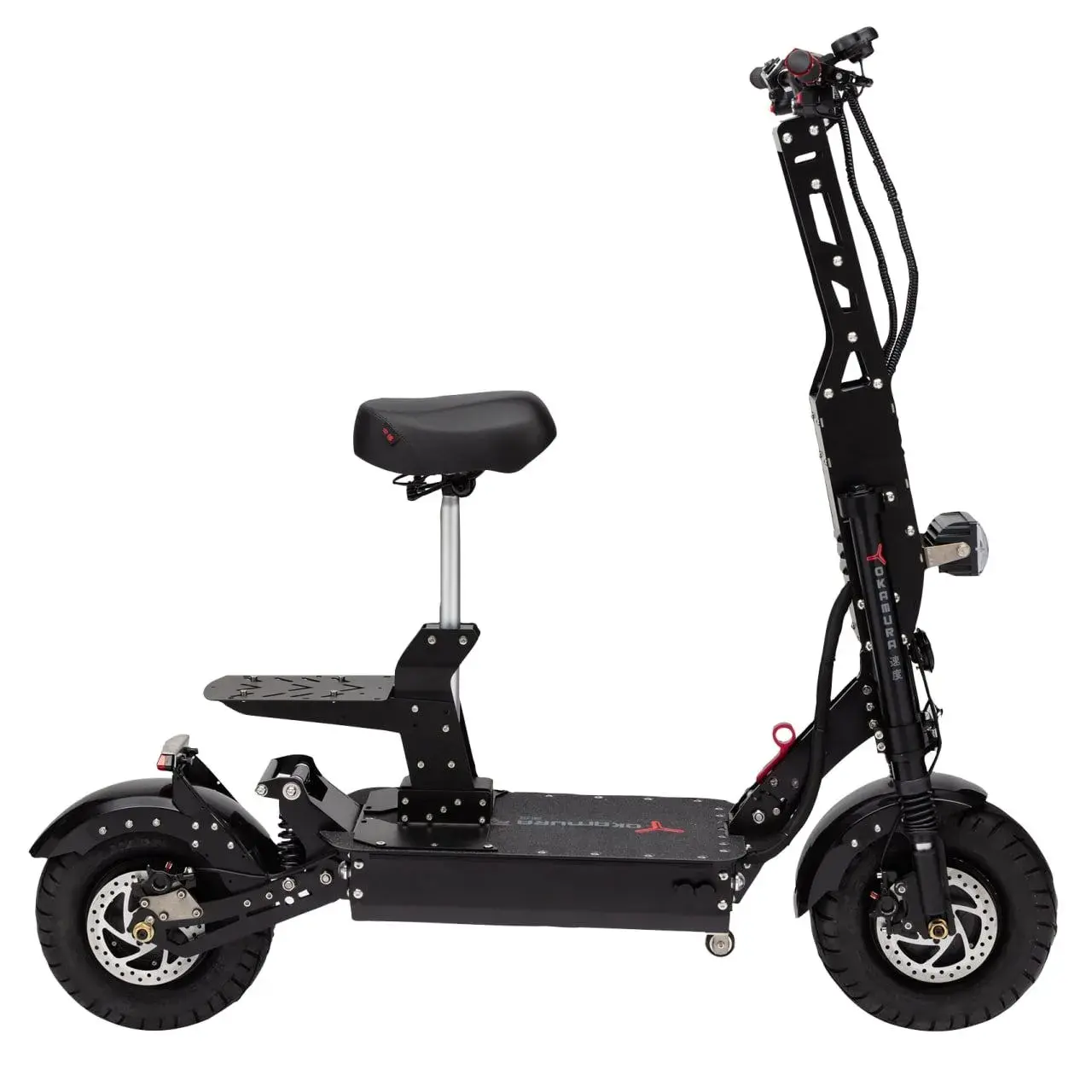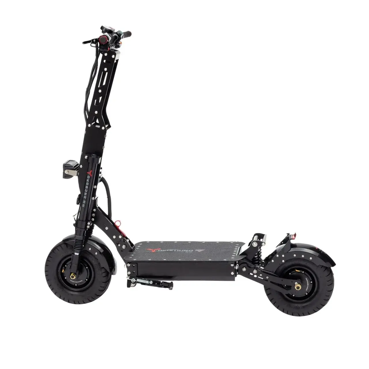 YOKAMURA RS - японский электросамокат, созданный только для зоны экстрима. Электросамокат имеет двойную переднюю вилку и мощный двигатель суммарной мощностью 6000 Вт. Большие 13-и дюймовые колеса на камерной резине отлично подходят для езды как по городу, так и по пересеченной местности. При нагрузке в 200 кг самокат набирает скорость около 80 км/ч. Емкость аккумуляторной батареи составляет 45 Ач/60B, что обеспечивает запас хода до 120 км на одном заряде. До 80 км/ч самокат способен разогнаться за 6 секунд, а набрать максимальную скорость вам удастся менее чем за 12 секунд.