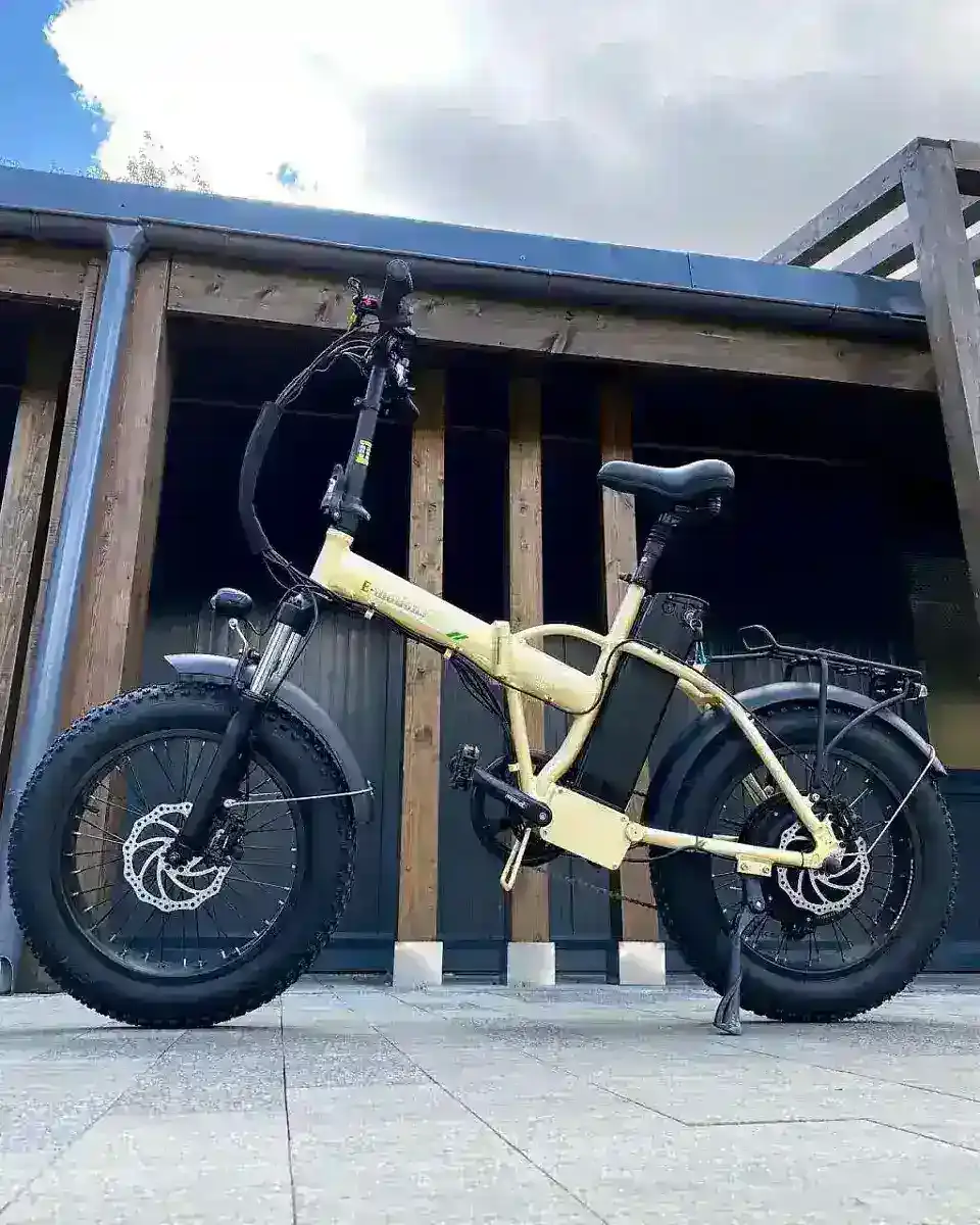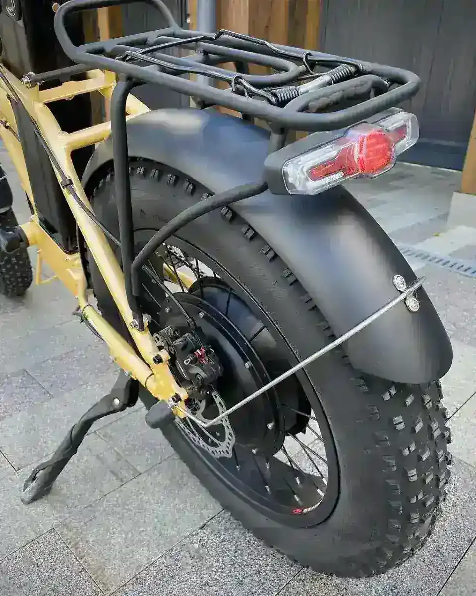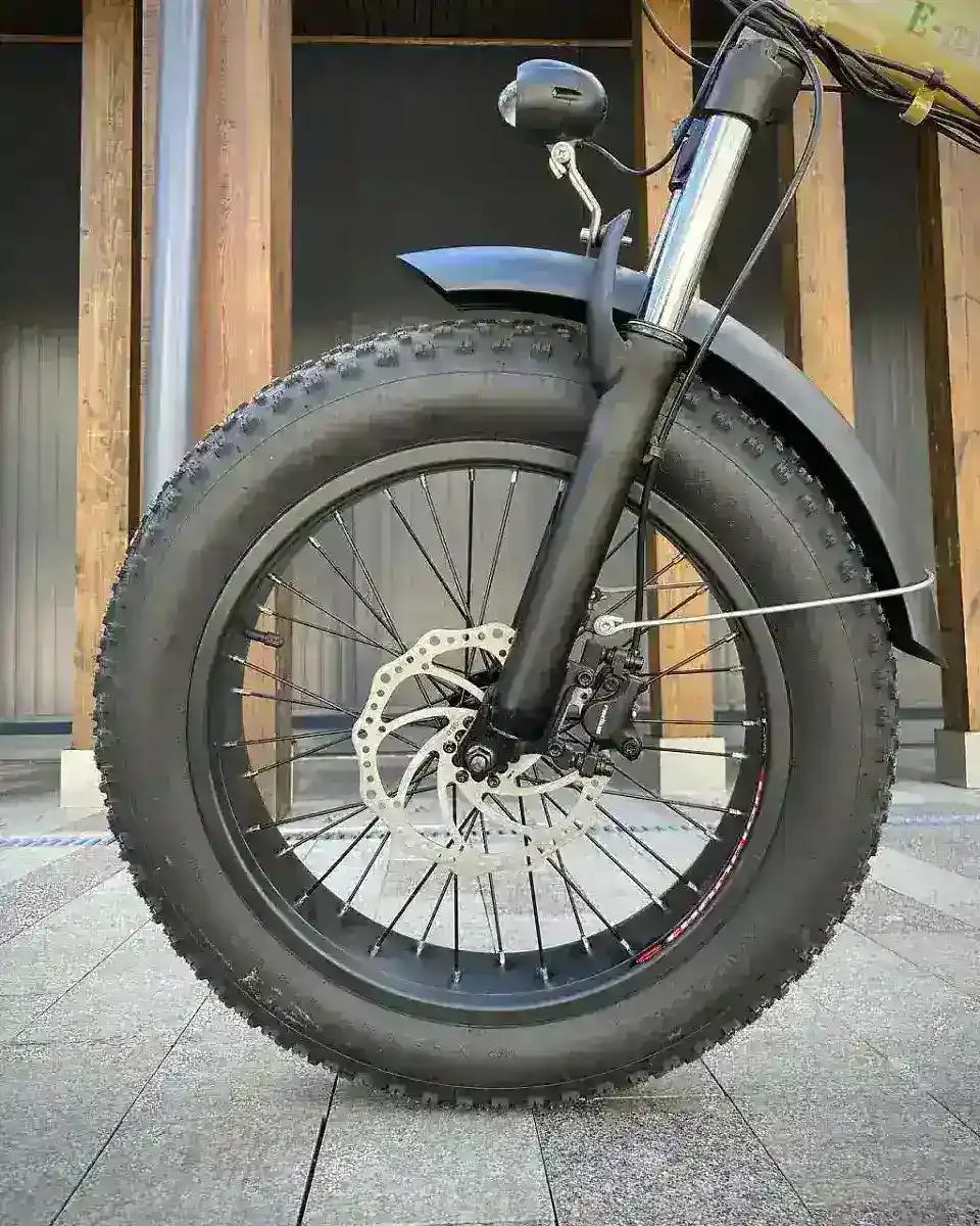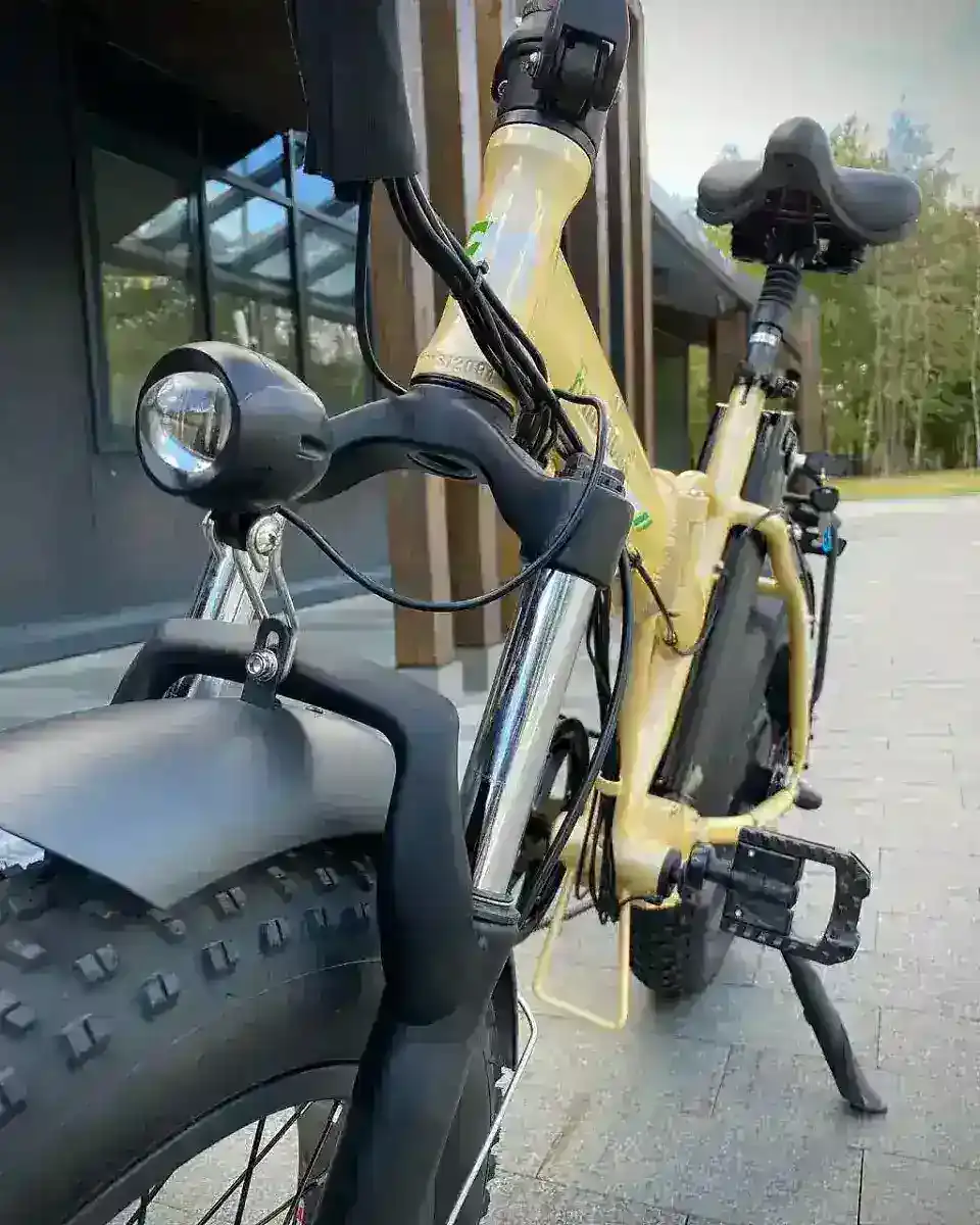 Заднеприводной электробайк оснащён алюминиевой рамой, быстросъёмной аккумуляторной батареей, в результате чего велосипед может свободно на одном заряде преодолевать расстояния до 40 км в режиме PAS со скоростью до 40 км/час. Кроме этого, колёса диаметром 20 дюймов отлично едут по асфальтированной дороге, грунтовке, брусчатке. Тормоза на переднем и заднем колесе дают меньший тормозной путь при экстренном торможении. Компактность – ещё одно преимущество этого фэтбайка. Складная модель с лёгкостью поместится в багажнике автомобиля, кладовке. Удобство и комфорт для поездок в ночное время обеспечивает мощный светодиодный фонарь спереди, среди других опций следует отметить регулированный руль, крылья и боковую подножку.