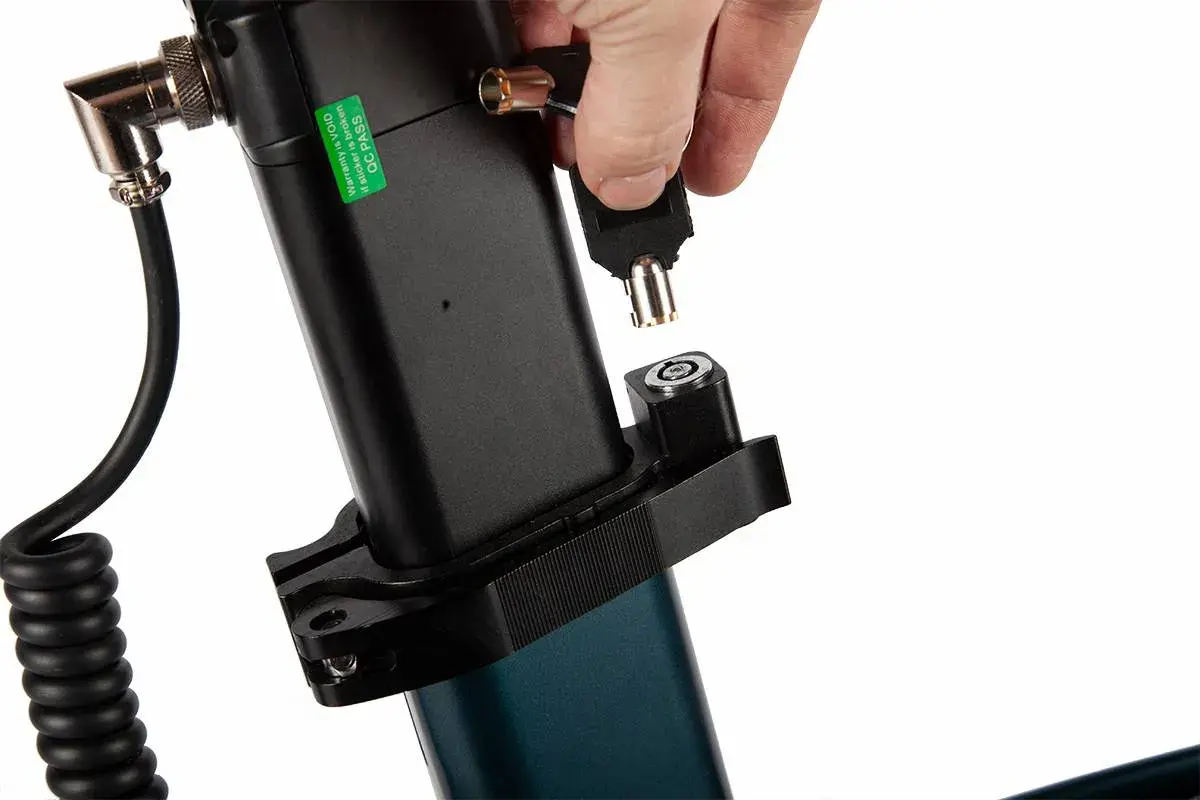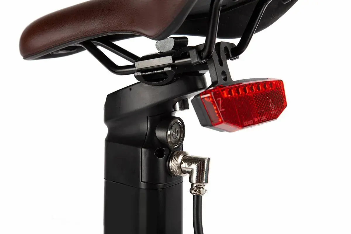 Аккумуляторная батарея на 36 Вольт, емкостью 6,8 Ач, изящно встроенная в подседельный штырь с помощью запирающего механизма и эффектного крепления с хромированный разъемом, обеспечивающим безопасное и надёжное соединение придаёт особое изящество дизайну велосипеда и приковывает к себе внимание!