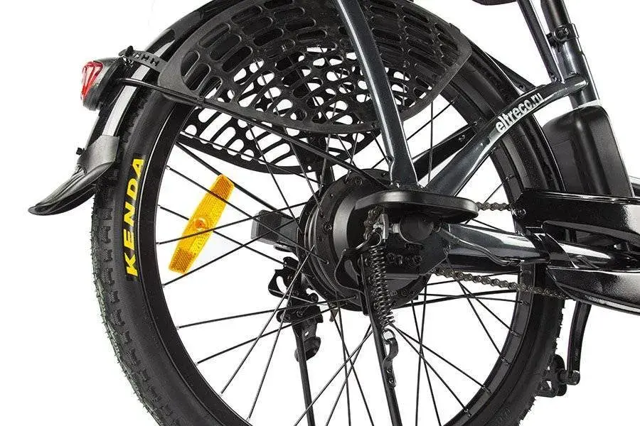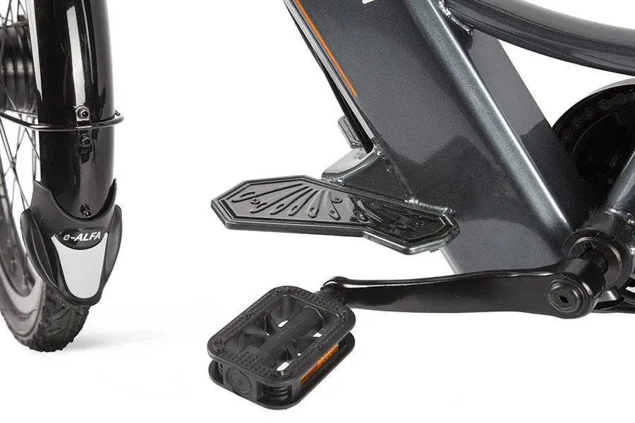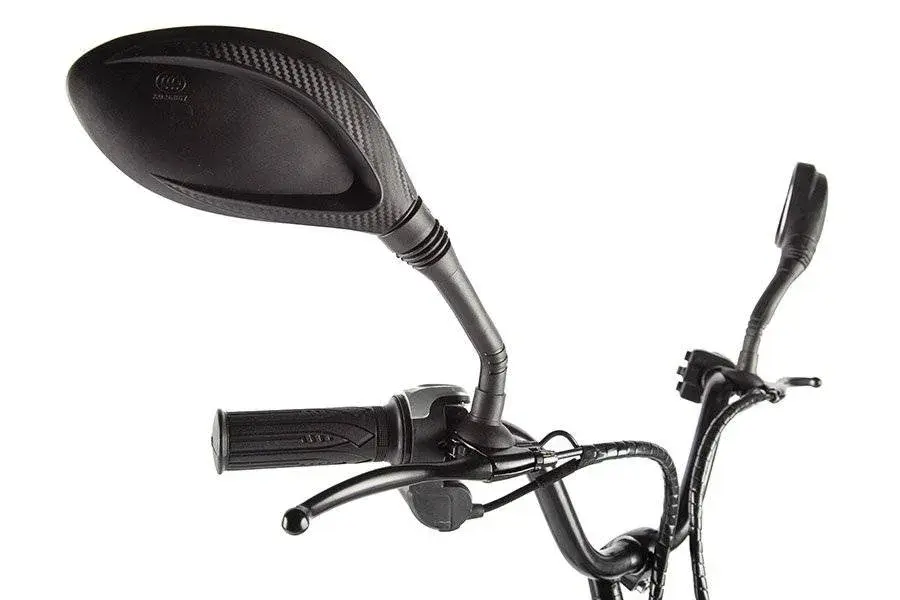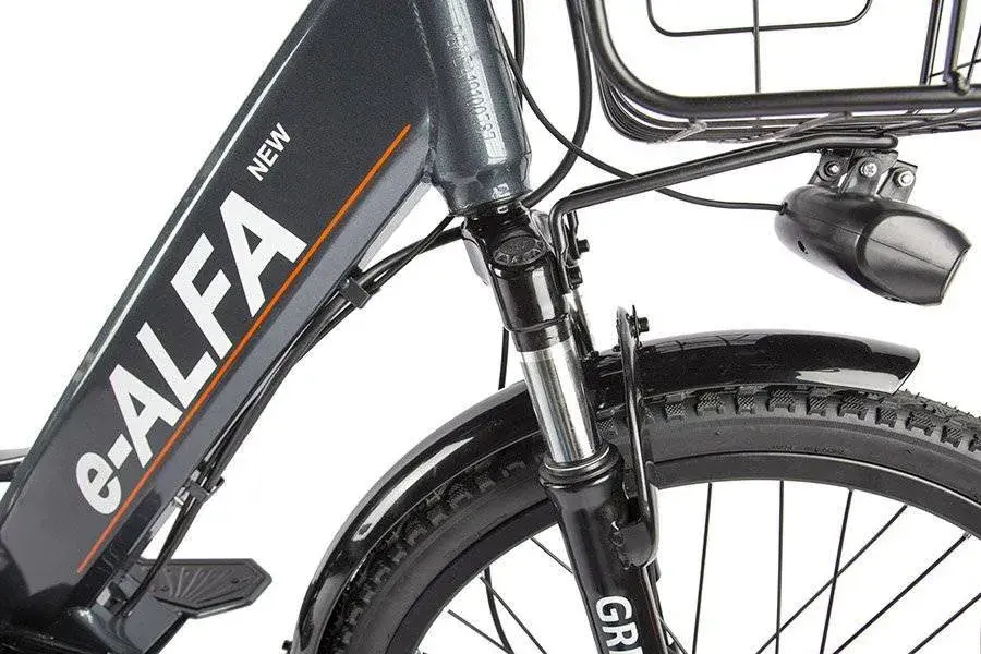 Электротранспорт укомплектован передней светодиодной фарой для безопасной езды ночью. На руле электровелосипеда e-ALFA NEW размещены зеркала заднего вида. Барабанными тормозами гарантируется безопасная остановка в ходе поездки. Передней амортизационной вилкой компенсируются неровности в ходе движения.
