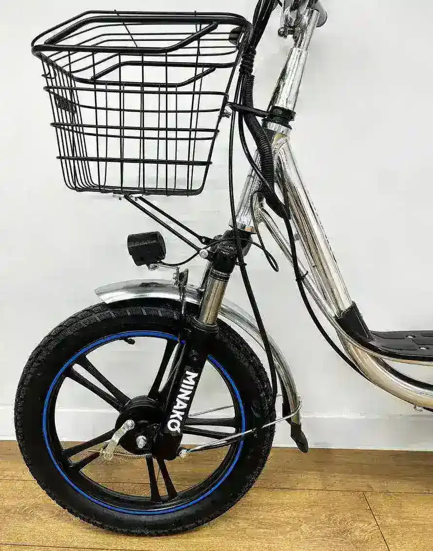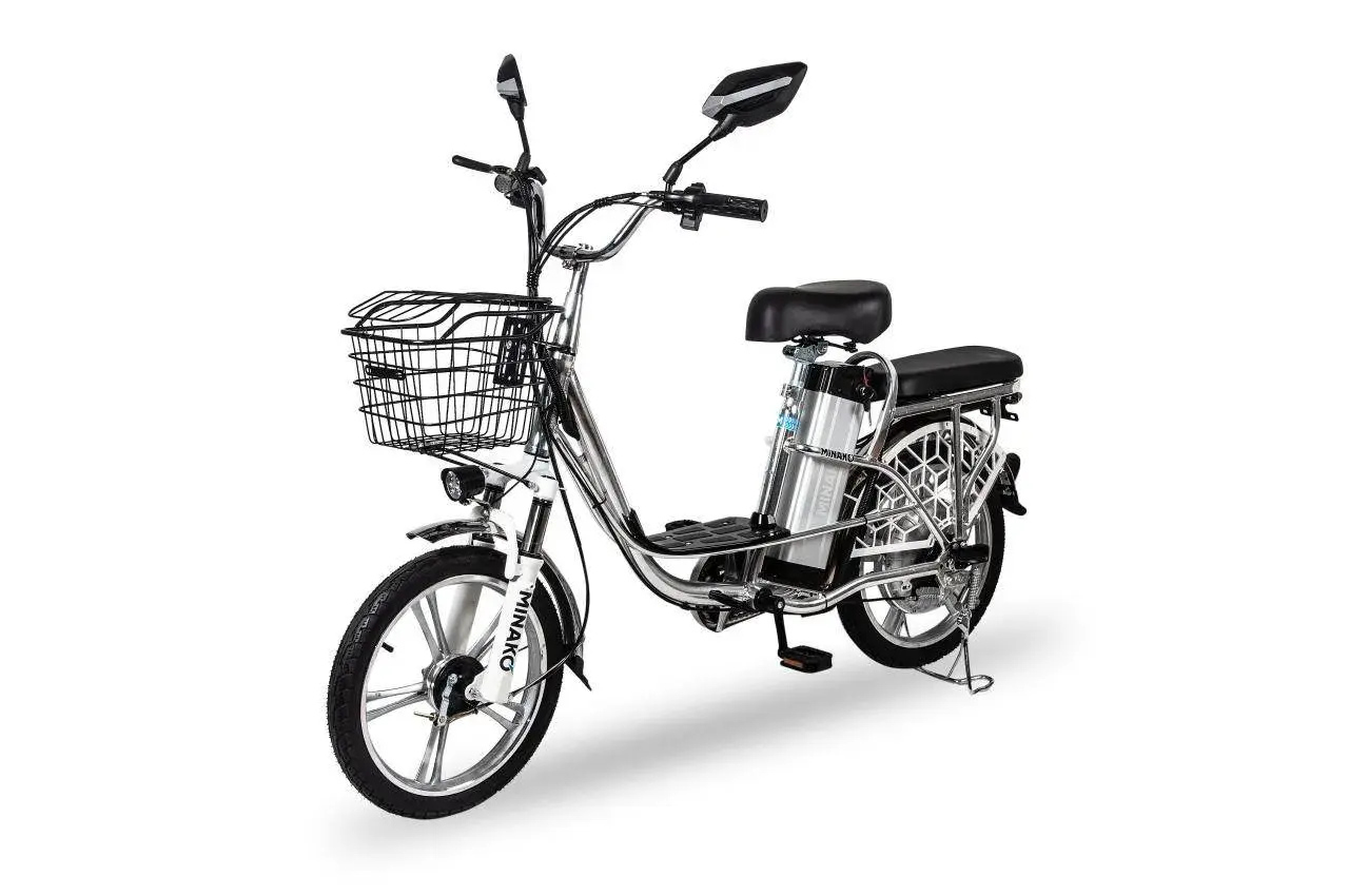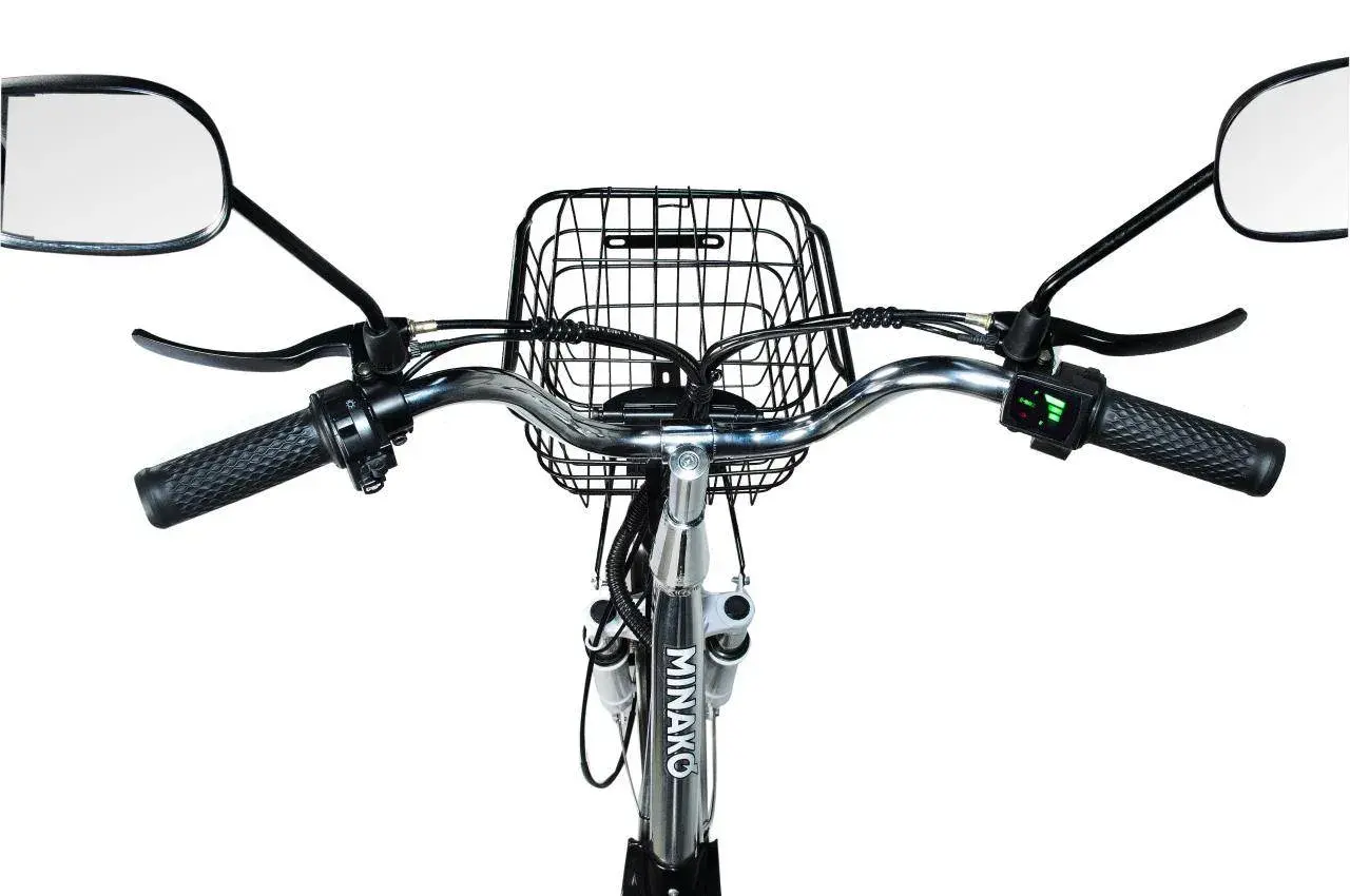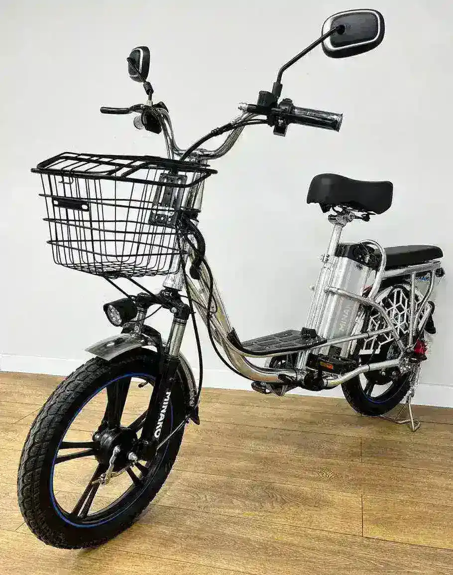 Электровелосипед Minako V2 - универсальная городская модель, с мощным двигателем, новыми колесами и корзиной. Мотор 240W позволяют набирать скорость до 45 км/ч. Емкий аккумулятор держит заряд до 45 км без подзарядки. Безопасное и плавное торможение обеспечивает барабанная тормозная система. Время зарядки занимает не более 6 часов. Электровелосипед выдерживает нагрузку до 140 кг, при этом вес самого велосипеда всего 27 кг.