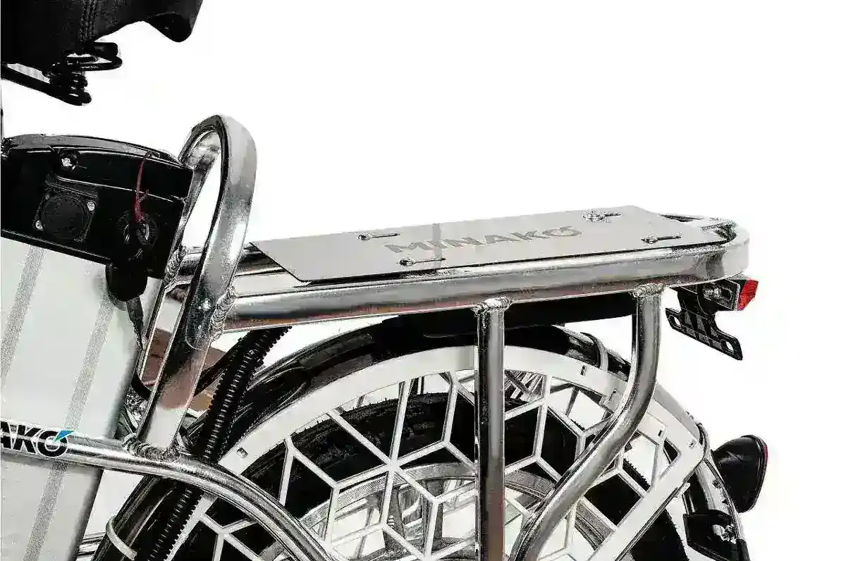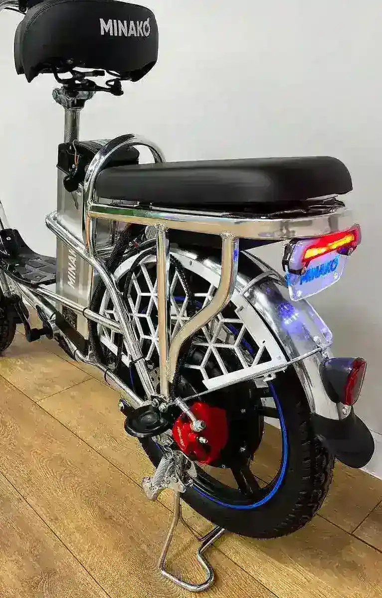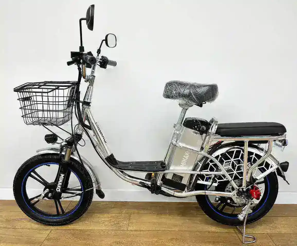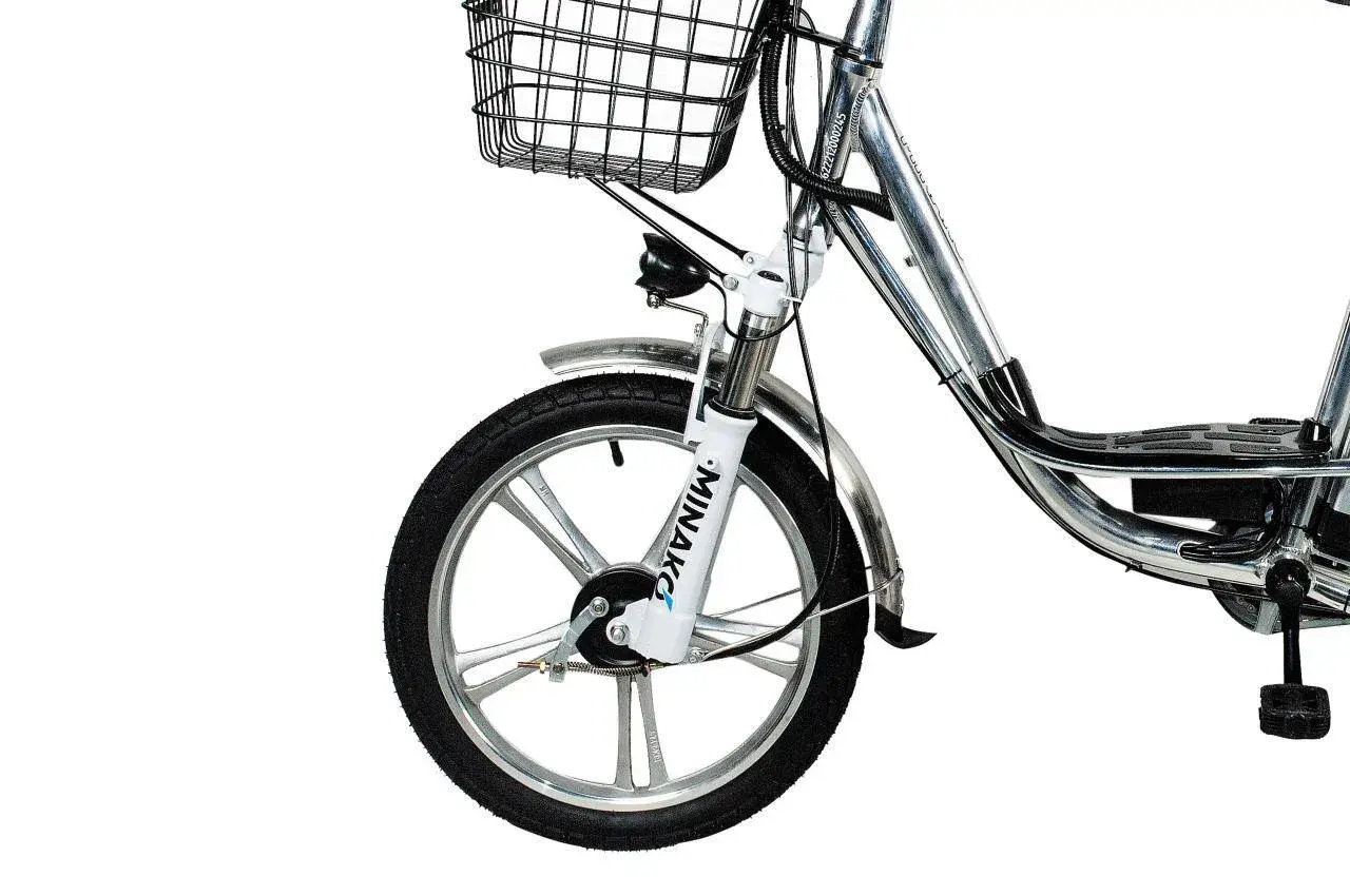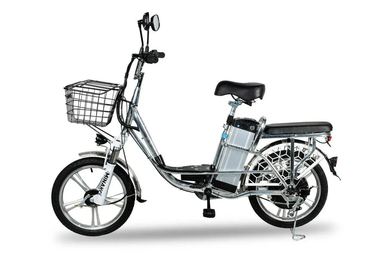Электровелосипед Minako V2 - универсальная городская модель, с мощным двигателем, новыми колесами и корзиной. Мотор 240W позволяют набирать скорость до 45 км/ч. Емкий аккумулятор держит заряд до 45 км без подзарядки. Безопасное и плавное торможение обеспечивает барабанная тормозная система. Время зарядки занимает не более 6 часов. Электровелосипед выдерживает нагрузку до 140 кг, при этом вес самого велосипеда всего 27 кг.