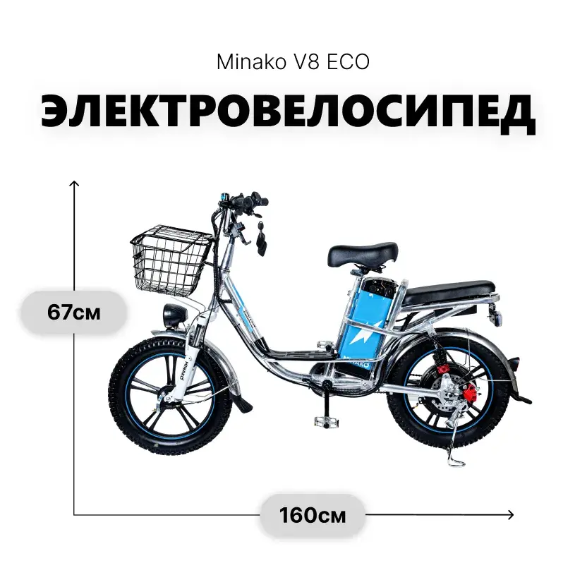 Minako V8 ЕСО был спроектирован компанией Minako, как электровелосипед для курьеров. Данная модель оптимально подходит для доставки еды, корреспонденции, интернет-заказов и прочих малогабаритных грузов.