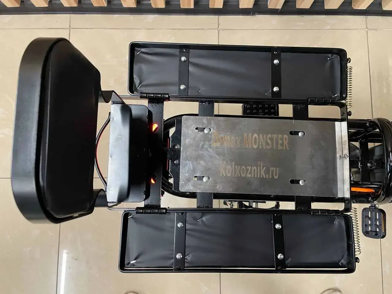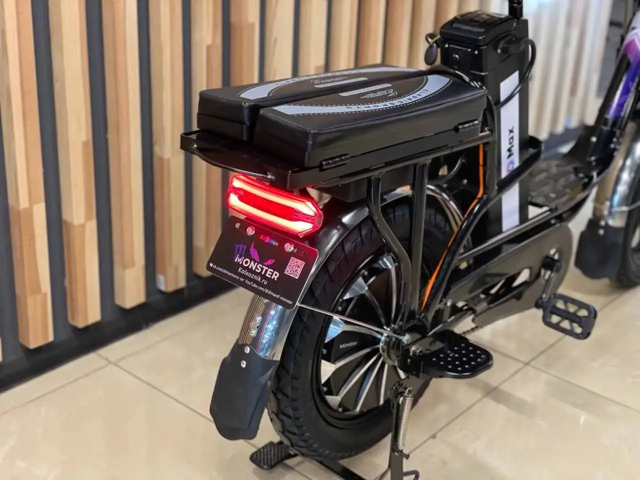 Низкая рама гарантирует удобство при посадке, что особенно актуально для людей пожилого возраста. Рама электровелосипеда изготовлена из стали, а рекомендуемая нагрузка – до 200 кг. MONSTER имеет удобную широкую платформу для ног, мягкое сиденье с амортизатором. Сзади расположен багажник-сиденье.