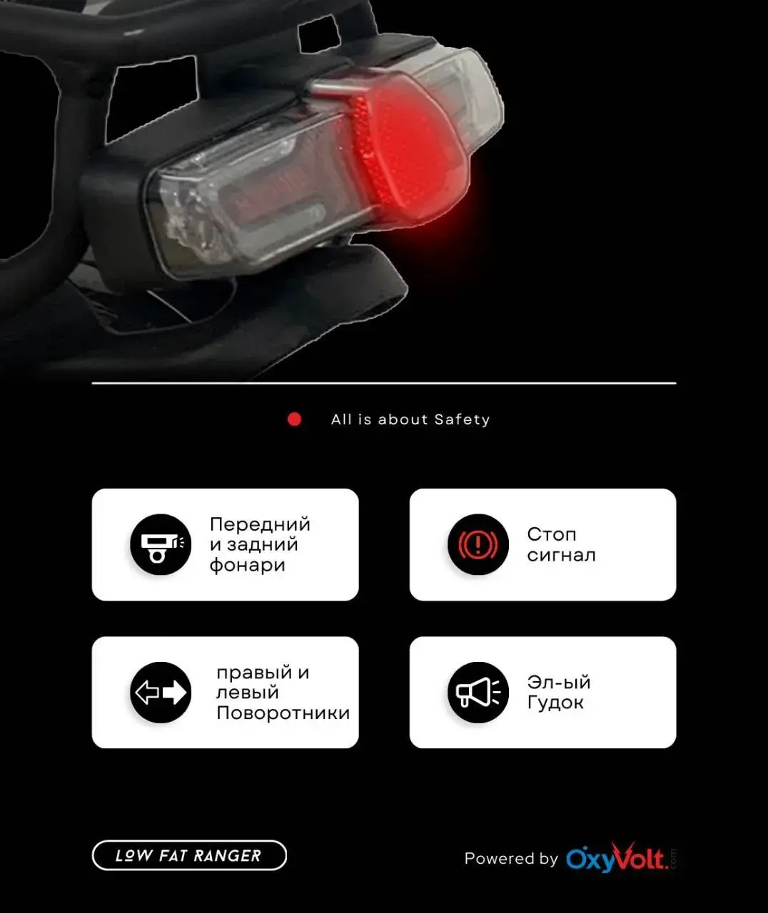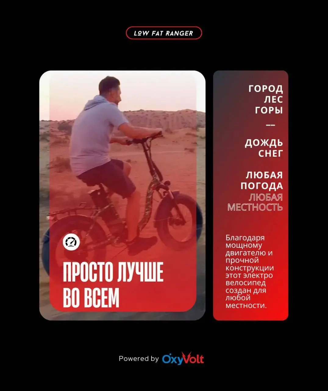 Электровелосипед Oxyvolt Low Fat Ranger - этот мощный электрофетбайк, оборудован задним 750 Ваттным мотор колесом. Велогибрид отлично справляется с подъемом в гору и подходит для длительных поездок по сложным ландшавтам и бездорожью. Быстро стартует и уверенно лавирует на поворотах. Способен разгоняться до 35 км/ч и преодолевать до 50 км на одном заряде.