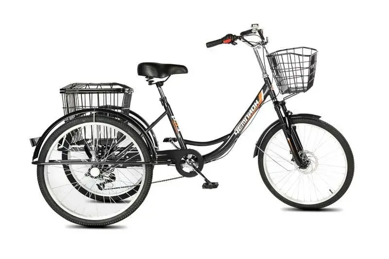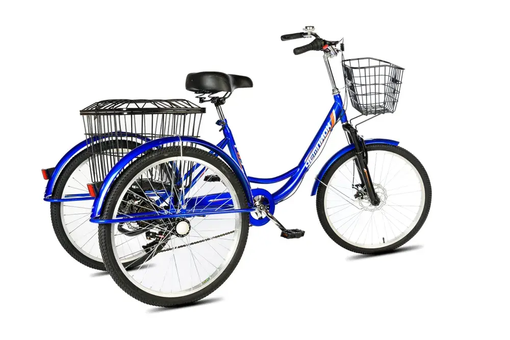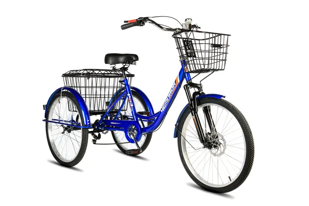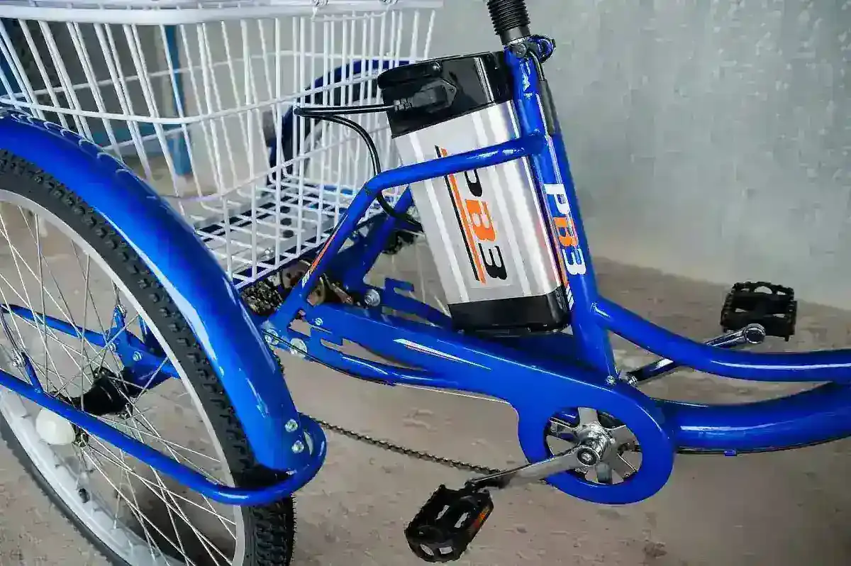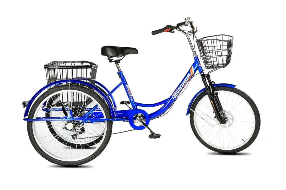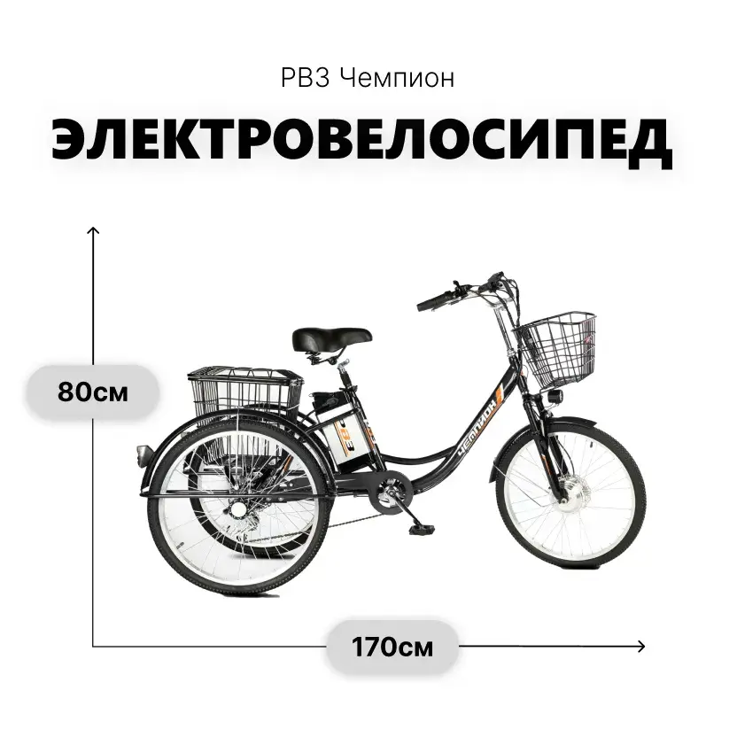 Электровелосипед трехколесный РВЗ Чемпион - новая модель трехколесного электровелосипеда для взрослых. Рама, вилка и втулки выполены из прочной стали. Покрышка широкая с внедорожным протектором, поэтому модель подойдет для эксплуатации в сельской местности и дачи. Емкий аккумулятор в 12 Ah позволяет проезжать до 50 км на одном заряде. Барабанный задний и V-brake передний тормоза обеспечивают безопасное и плавное торможение. Перевозить грузы и небольшие сумки позволит передняя и задняя корзины.