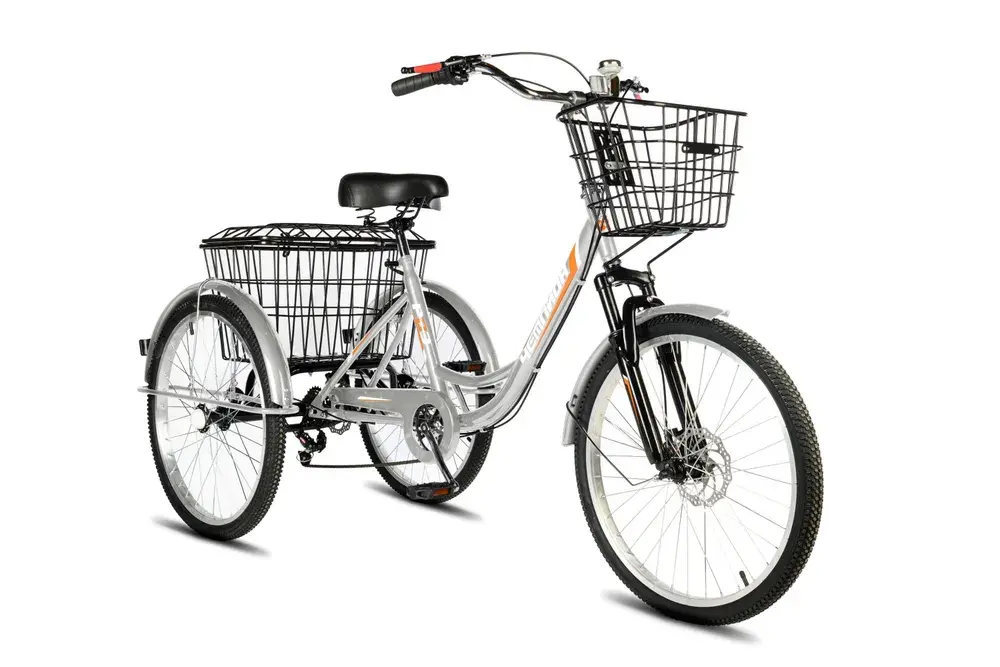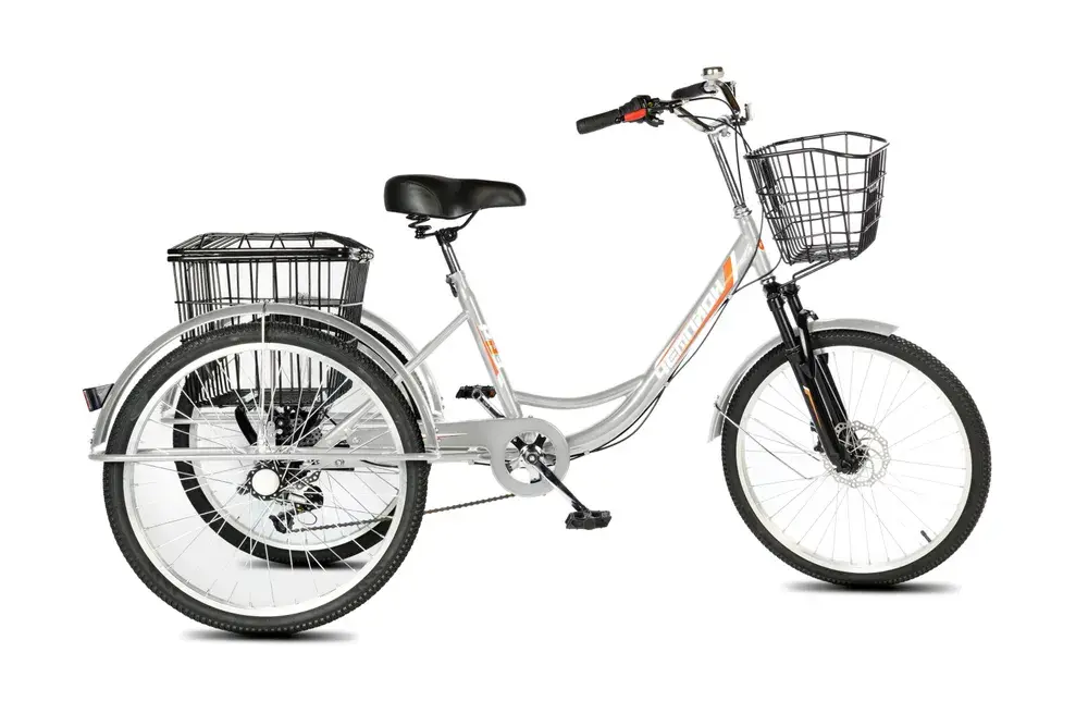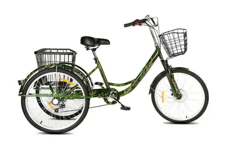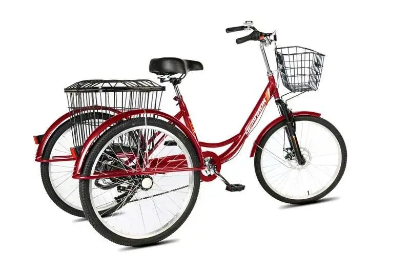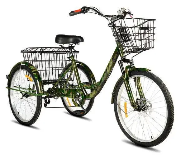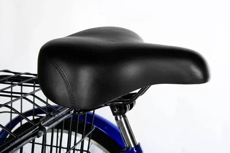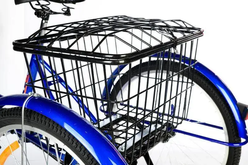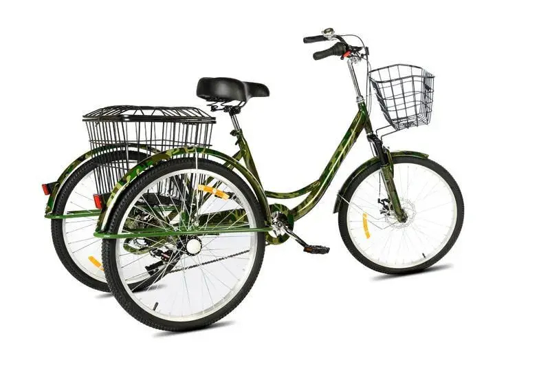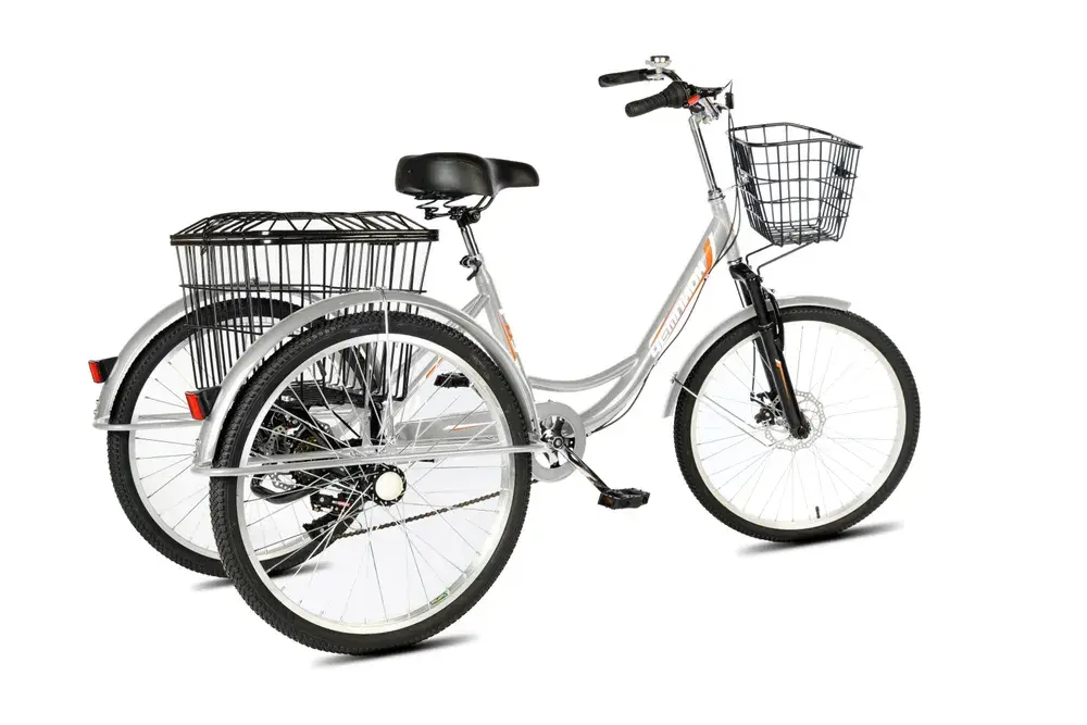 Электровелосипед трехколесный РВЗ Чемпион - новая модель трехколесного электровелосипеда для взрослых. Рама, вилка и втулки выполены из прочной стали. Покрышка широкая с внедорожным протектором, поэтому модель подойдет для эксплуатации в сельской местности и дачи. Емкий аккумулятор в 12 Ah позволяет проезжать до 50 км на одном заряде. Барабанный задний и V-brake передний тормоза обеспечивают безопасное и плавное торможение. Перевозить грузы и небольшие сумки позволит передняя и задняя корзины.