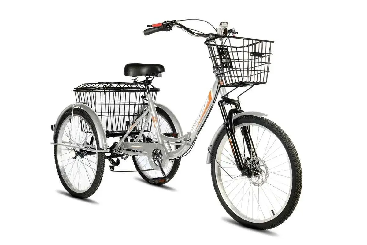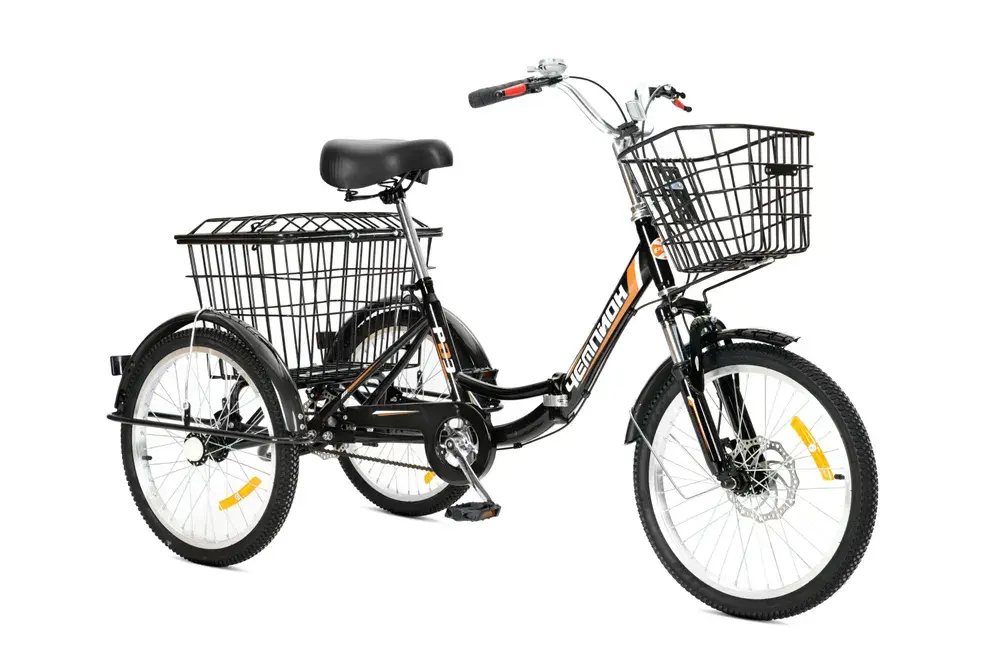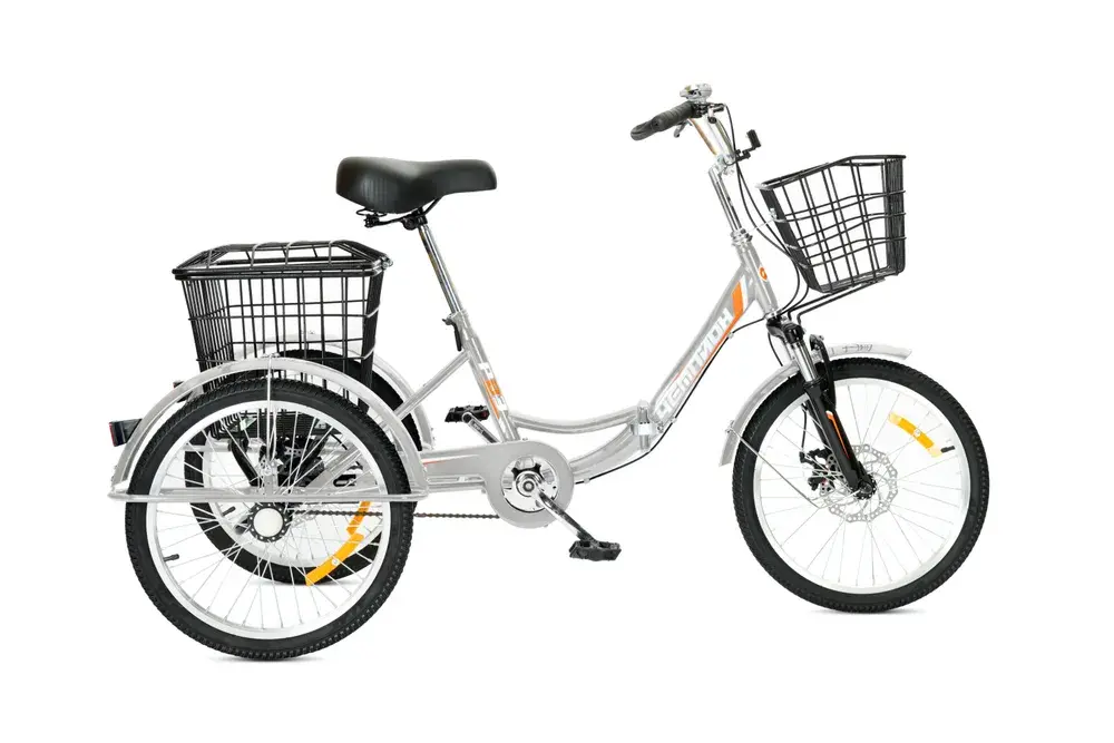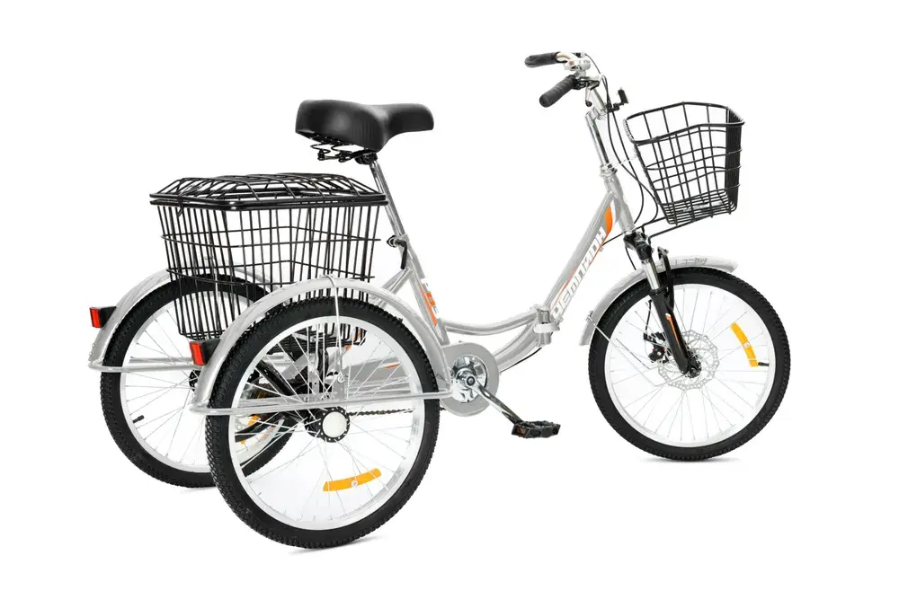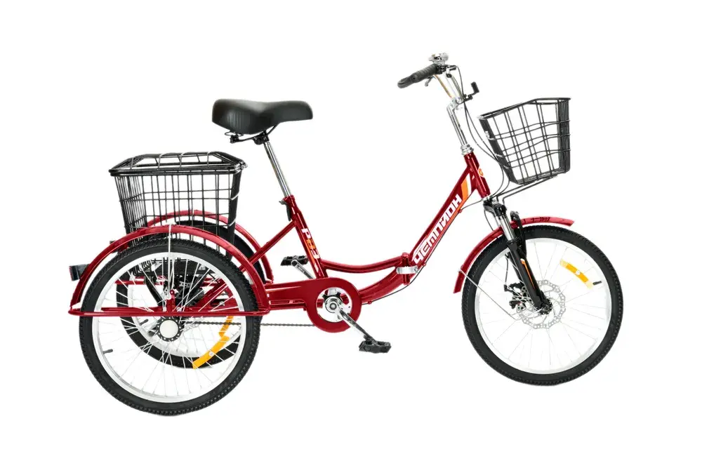 Электровелосипед трехколесный РВЗ Чемпион складной - новая модель трехколесного электровелосипеда для взрослых. Рама, вилка и втулки выполнены из прочной стали. Покрышка широкая с внедорожным протектором, поэтому модель подойдет для эксплуатации в сельской местности и дачи. Емкий аккумулятор в 12 Ah позволяет проезжать до 50 км на одном заряде. Барабанный задний и V-brake передний тормоза обеспечивают безопасное и плавное торможение. Перевозить грузы и небольшие сумки позволит передняя и задняя корзины.